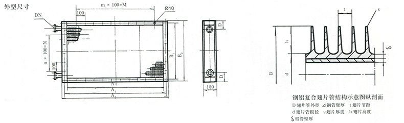 | 外徑D(mm) | 翅片高度h(mm) | 翅片厚度s(mm) | 翅片節(jié)距t(mm) | 鋁管壁厚h(mm) | 鋼管壁厚h(mm) | 總外表面積Sw(m²/m) |
